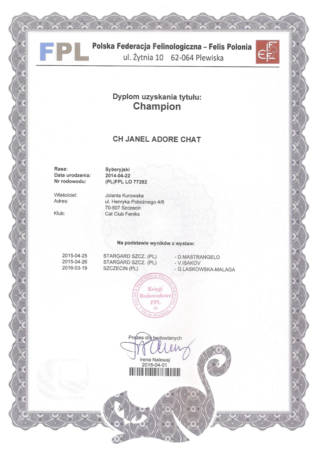 CH JANEL Adore Chat (FR) – osiągnięcia